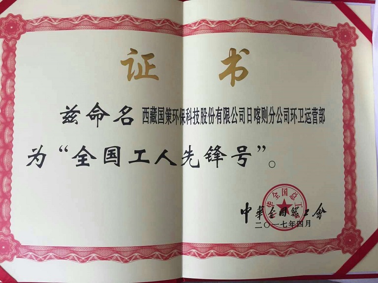 日前,全國總工會召開“五一”新聞發(fā)布會, 通報了一批“2017年全國工人先鋒號”。西藏國策環(huán)保科技股份有限公司日喀則分公司運營部全體成員在日常工作中勞心勞力、風(fēng)雨無阻、踐行無私奉獻(xiàn)的城市“美容師”精神,被授予“2017年全國工人先鋒號”,是我司首獲此殊榮。